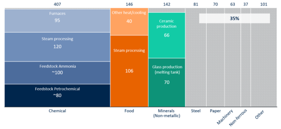 Tre settori industriali si distinguono per la richiesta di ben due terzi di gas naturale dell’industria dell’UE: prodotti chimici, prodotti alimentari e minerali non metallici cioè vetro e ceramica. Lavorando bene sul consumo di questi segmenti, si potrebbe ragionevolmente ridurre del 25% la domanda totale di gas dell’industria dell’UE nei prossimi 5 anni.